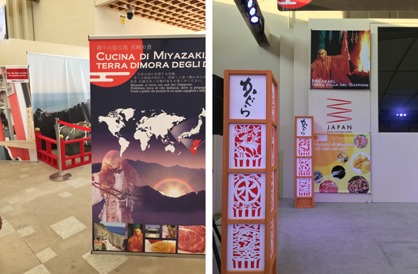 【ミラノ万博レポート】 ミラノ万博出展に先立ち 9月1日にイタリア・ミラノ市のシェフやマスコミ、商工会議所関係者ら約100人を招いたレセプションパーティーで料理を披露しました。宮崎県の河野知事、ミラノ市長の挨拶後、万博で提供する料理や地ビール、焼酎などを招待客に振る舞い、現地シェフとの食の料理パフォーマンスもいたしました。 【9月2日〜5日】 イタリア・ミラノ国際博覧会(万博)の「日本館」イベント広場で9月2日〜5日まで特産の宮崎牛など豊かな自然が育んだ宮崎県の食の魅力を紹介するイベント「神々の宿る地 宮崎の食」が開かれました。 県産食材を使った調理の実演や試食のほか、同県西都市に伝わる五穀豊穣を祈る銀鏡神楽も海外で初めて披露され、食と伝統文化のつながりをアピールしました。 ゆずチリのソースを合わせた宮崎牛ステーキや、黒ニンニクとイタリアのチーズのカナッペ、宮崎県串間市の黒瀬ぶり、諸塚村のしいたけ、道本食品さんのたくわんをつかった手まり寿司3種盛などをデモンストレーション紹介しました。 →宮崎日日新聞の記事はこちら |